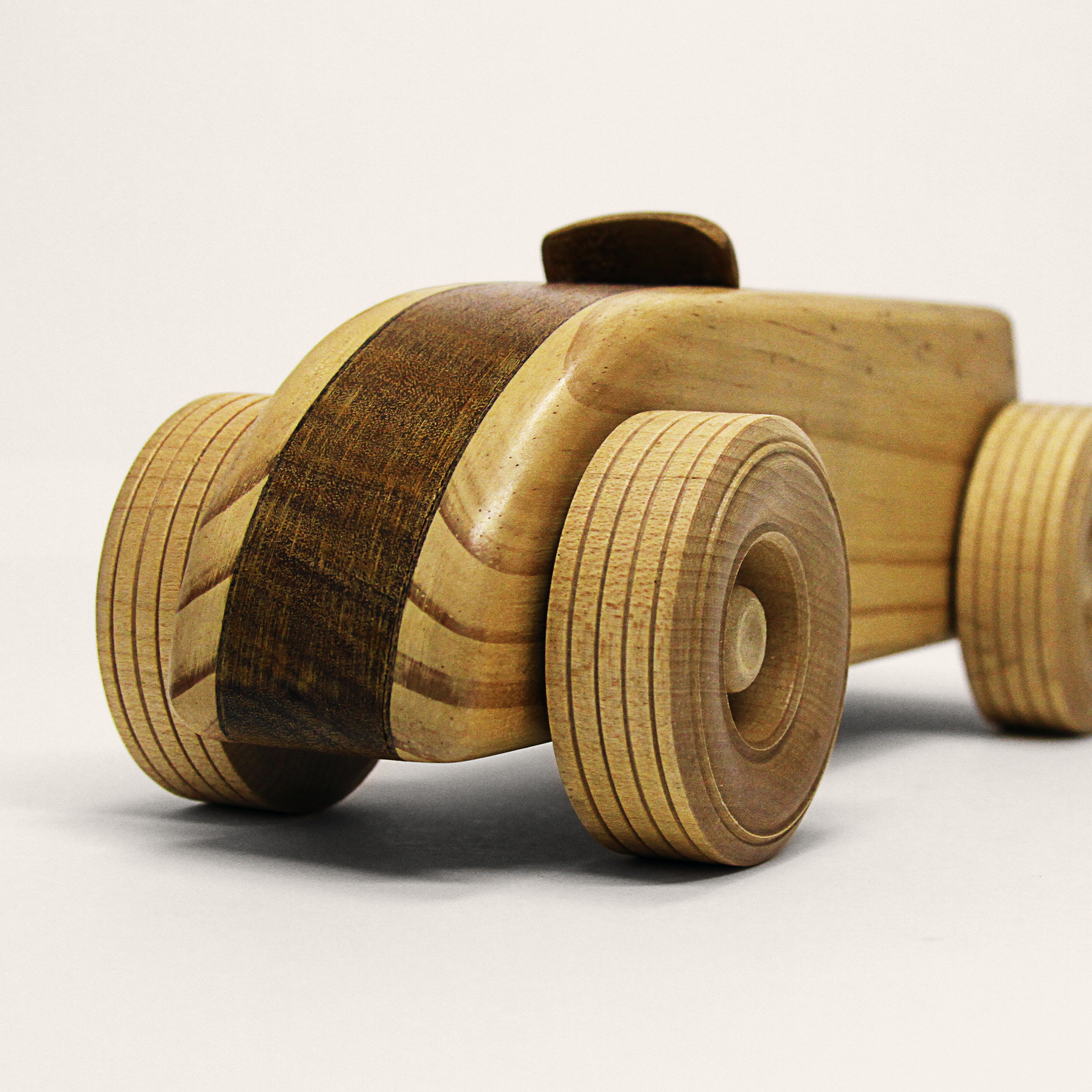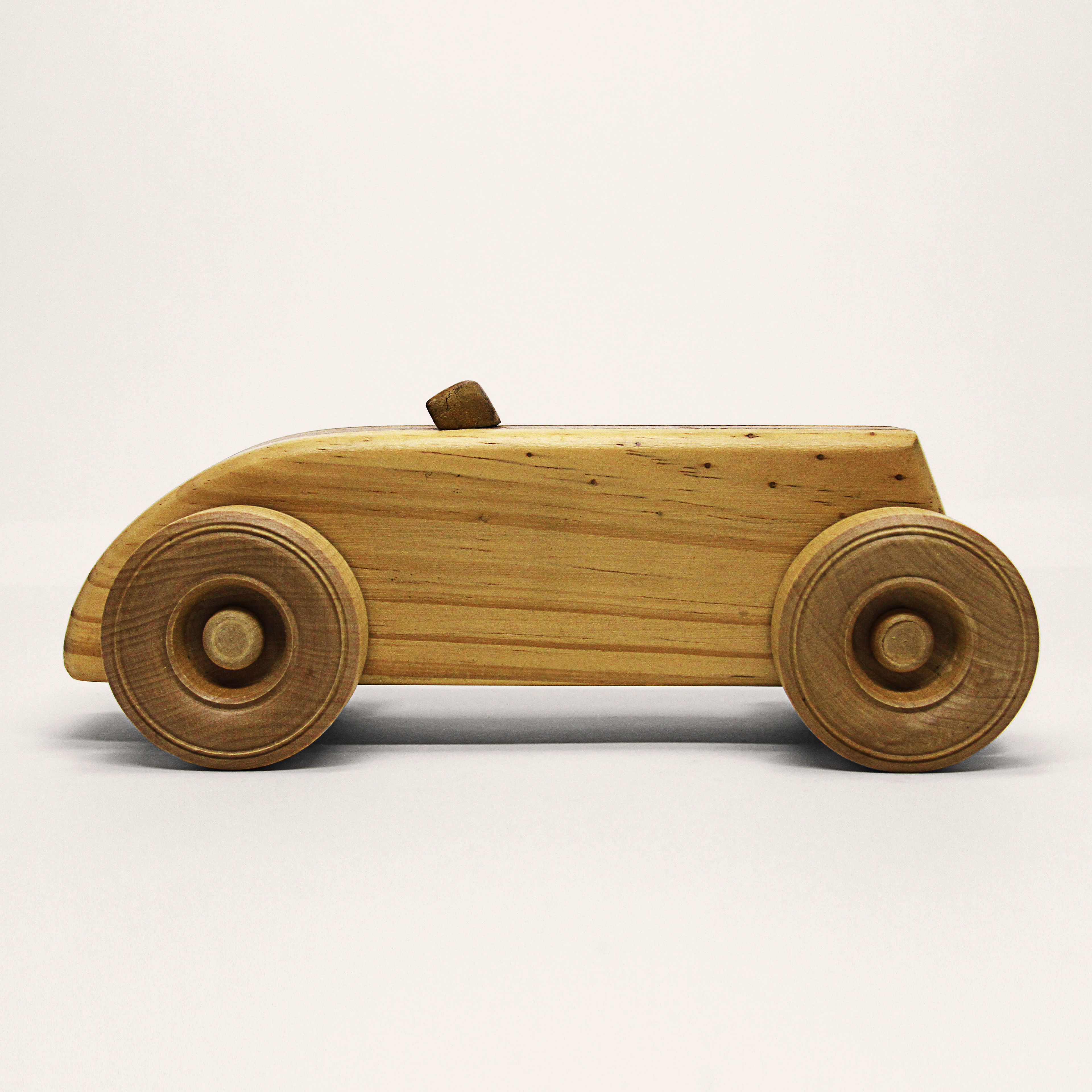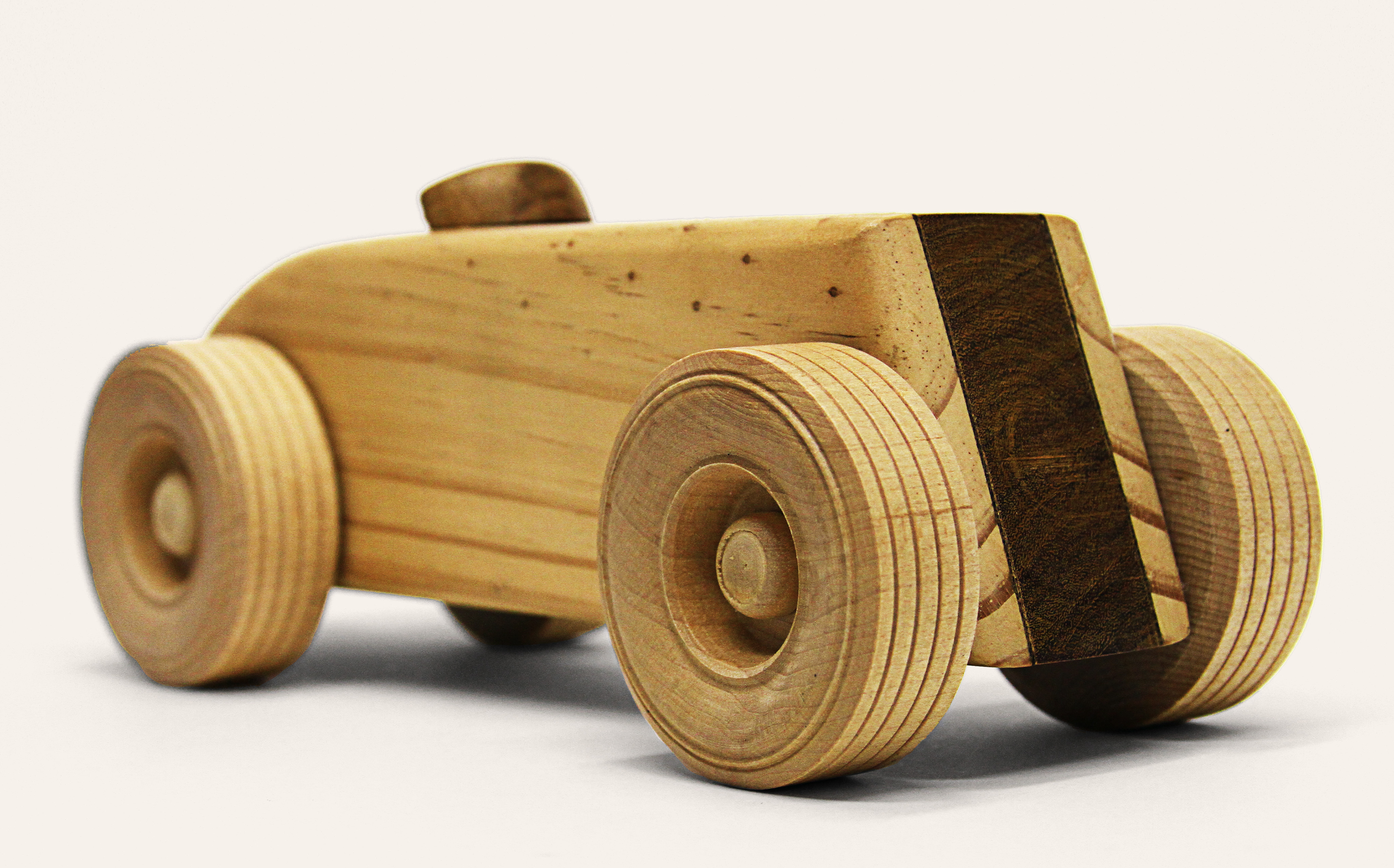 É um carrinho de desenho retrô e minimalista, fruto da mistura de minha paixão pelo design de carros e brinquedos com a marcenaria.